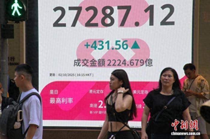 10月2日,香港恒生指数收市报27287.12点,上升431.56点,升幅为1.61%,全日成交金额为2224.68亿港元。 中新社记者 陈永诺 摄