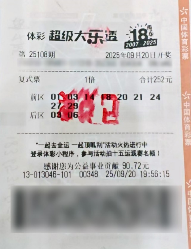 9月20日,超级大乐透第25108期开奖。前区开出号码14、18、21、24、29;后区开出号码03、06。当期上海开出1注基础一等奖,出自一张“9+2”票面金额为252元的复式票,单票奖金1007万余元。该张大乐透一等奖彩票出自位于嘉定区外冈镇北街春及路37号的13046网点。