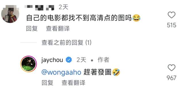 或许是意识到了自己这句话有问题,目前这条评论已经找不到了。而有网友也问了类似的问题,调侃周杰伦自己的电影都找不到高清图,这回周杰伦的回应倒是很客气:赶着发图。