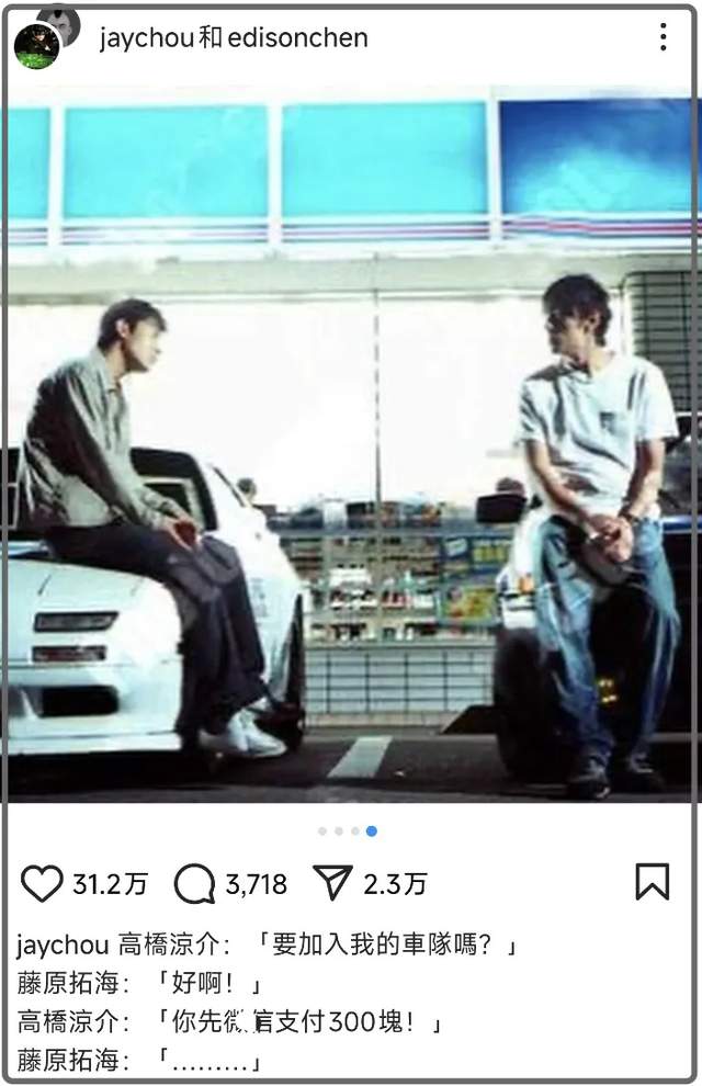 当年周杰伦与陈冠希合作的《头文字D》风靡亚洲,电影名场面无数,也成为了一代人的回忆。而电影拍完之后,周杰伦与陈冠希一直都有联系,此次二人再次同框,直接上演了一波回忆杀。而且周杰伦还把《头文字D》里的梗和陈冠希现实的“借我三百块”的梗结合了一下,相当喜感。